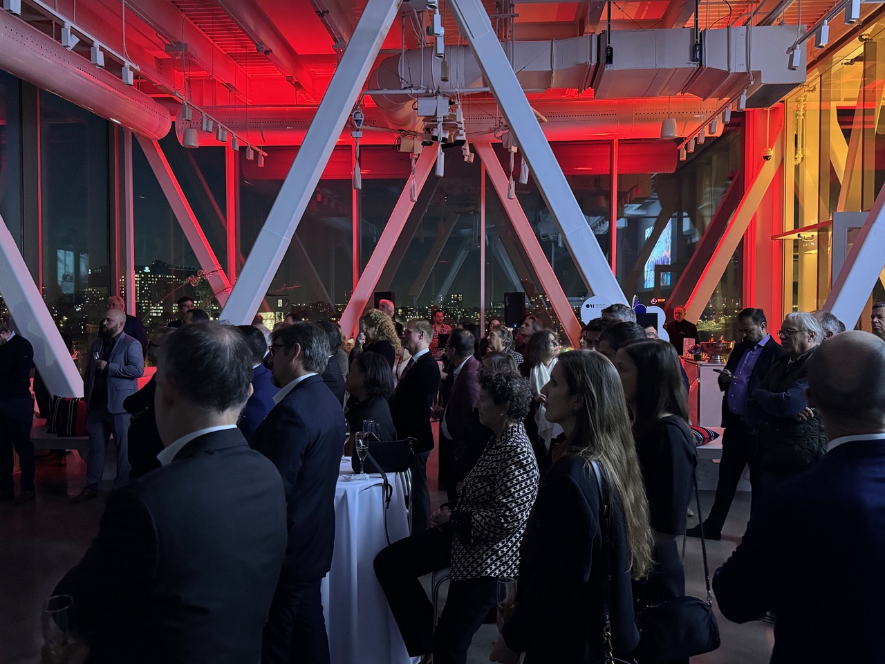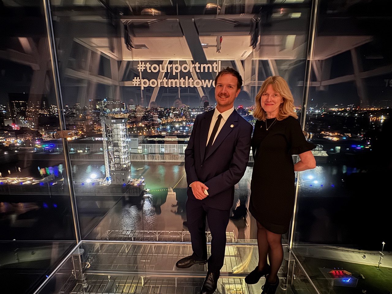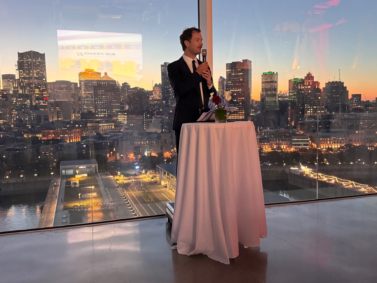 L’endroit choisi pour l’occasion, la très translucide Tour du Port de Montréal, était difficile à battre : au sommet de cet élégant monument tout habillé de verre, tout le monde s’est senti « suspendu entre ciel et terre », comme l’a dit Michel Miraillet, ambassadeur de France au Canada, tandis que devant le panorama de gratte-ciel qui se profilait au loin, « c’est tout Montréal qui a célébré » d’ajouter Yves Beauchamp, PDG d’Aéroports de Montréal.