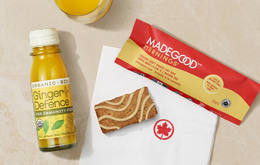 Des produits canadiens populaires, comme les barres moelleuses à l’avoine MadeGood Mornings à saveur de brioche à la cannelle et la boisson bien‑être Ginger Defence de Greenhouse, offerts sans frais, s’ajoutent à notre offre de produits à bord
