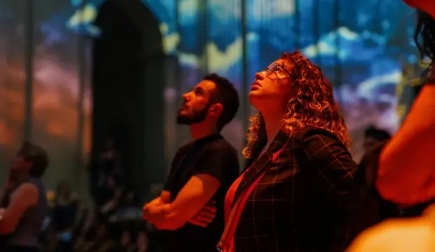 Tandis que les formes et les lumières dansent, les spectateurs déambulent. Grâce à la magie des fresques vidéo, des statues émergent des murs et semblent prendre vie, un obélisque fait la roue comme la queue d’un paon…