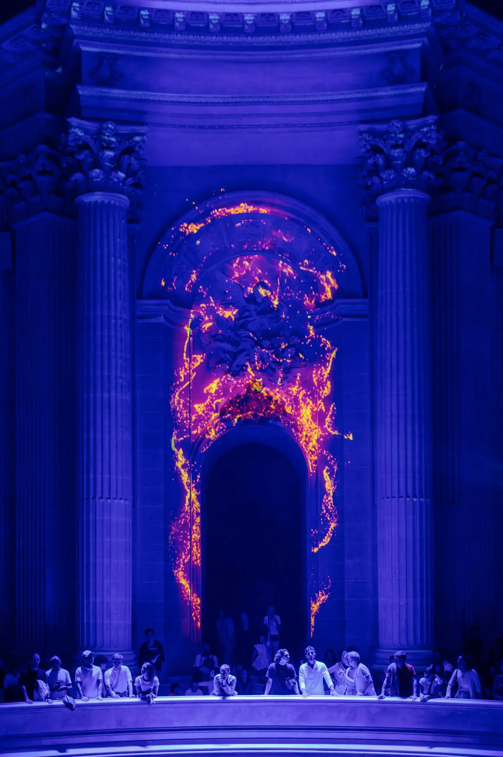 En finale, le troisième acte donne lieu à une orgie d’effets visuels, lasers compris, toujours en exploitant au maximum le cadre environnant. Sous les manipulations numériques de Moment Factory, des tisons de pixels lèchent les colonnes, des éclairs et des flashes sont décochés, la musique se fait insistante, l’émotion s’élève d’un cran.