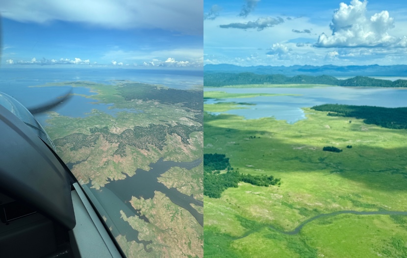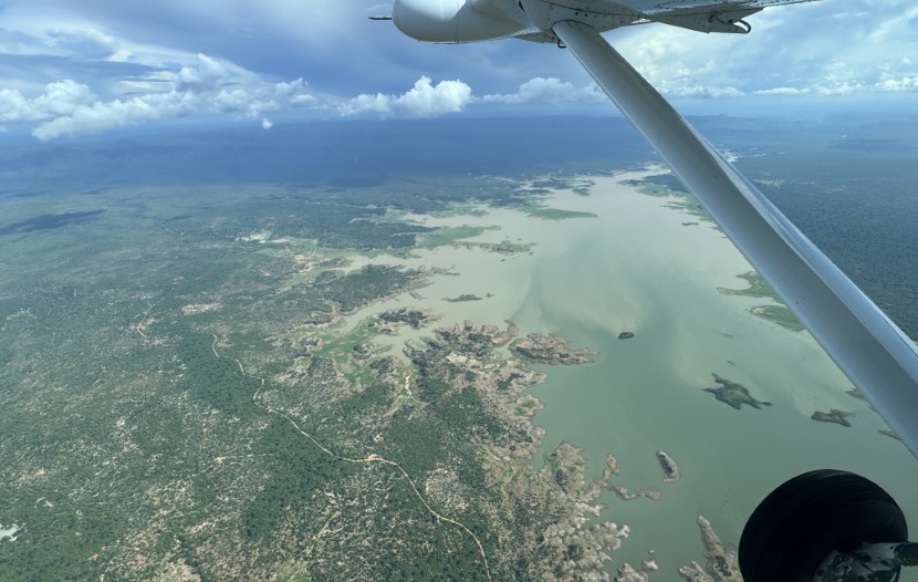 Du haut du ciel, à bord d’un Cessna de 12 passagers, on aperçoit savanes et forêts à perte de vue, mais on suit également le fil du Zambèze, quatrième fleuve d’Afrique, qui s’étire sur 2574 km entre la Zambie et le Mozambique.