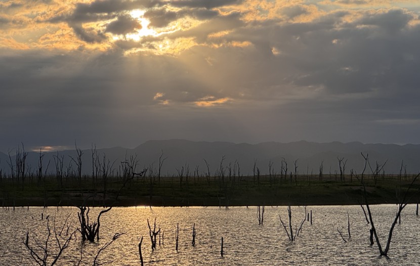 Le cadre est vraiment singulier, entre la grande chaîne montagneuse sur laquelle s’adosse le parc et l’immensité des plaines qui bordent le lac, sur fond d’autres montagnes.
