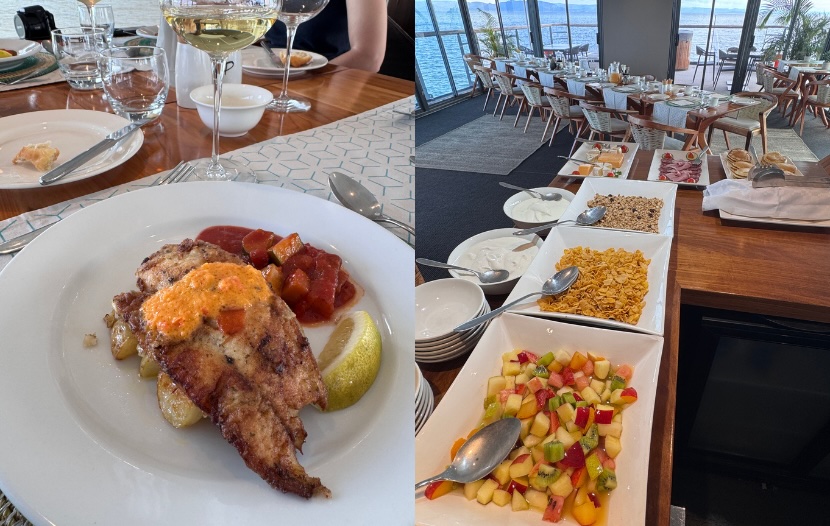 Si le petit déjeuner fort complet est offert sous forme de buffet, les repas du midi et du soir sont servis en menu fixe : agneau braisé, porc sauce paprika et champignons, filet de bœuf sauce Masala, gâteau dattes et caramel à la crème anglaise…