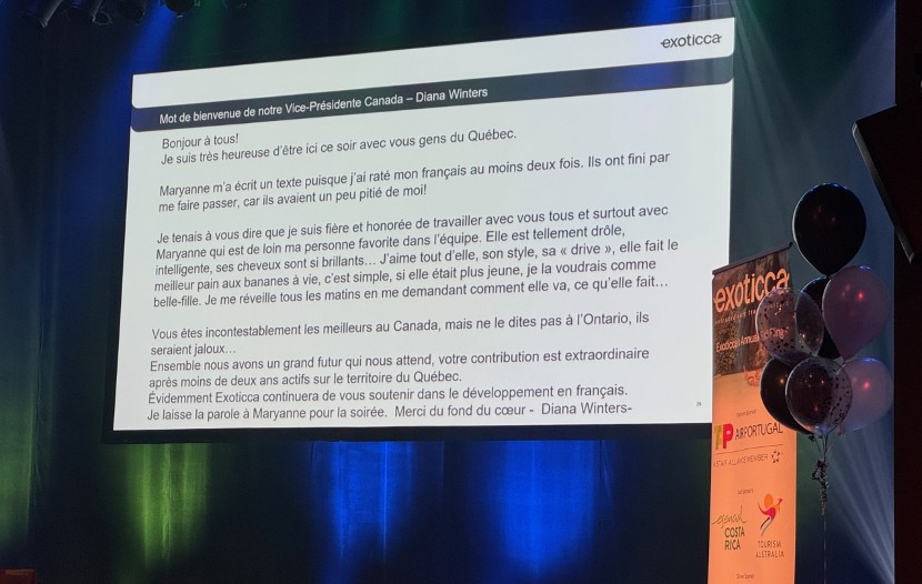 Diana Winters, vice-présidente des ventes d’Exoticca au Canada, a d’abord salué la percée du voyagiste au Québec. « Ce marché est l’un de nos meilleurs, la croissance y est incroyable, et c’est surtout à Maryanne qu’on le doit », a-t-elle dit avant de s’excuser de ne pas pouvoir s’exprimer en français et de publier un message écrit à l’attention de tous les conseillers présents.