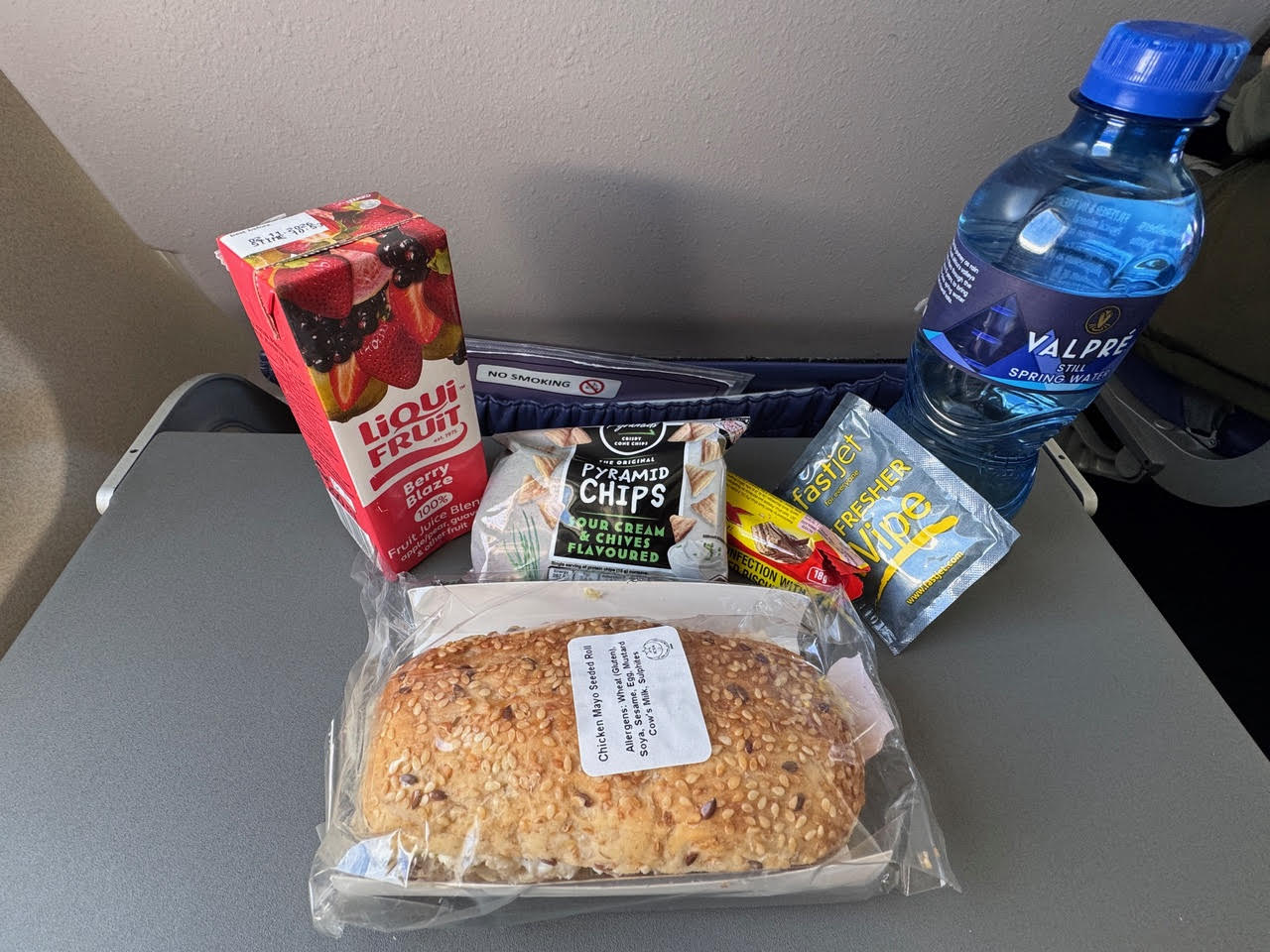 Bien qu’il ne durait que 90 minutes, le vol a tout de même donné lieu à un léger goûter très honnête (sandwich poulet-mayo, jus, craquelins, microbarre de chocolat, café…) servi par un agent de bord particulièrement souriant, sympathique et attentionné.