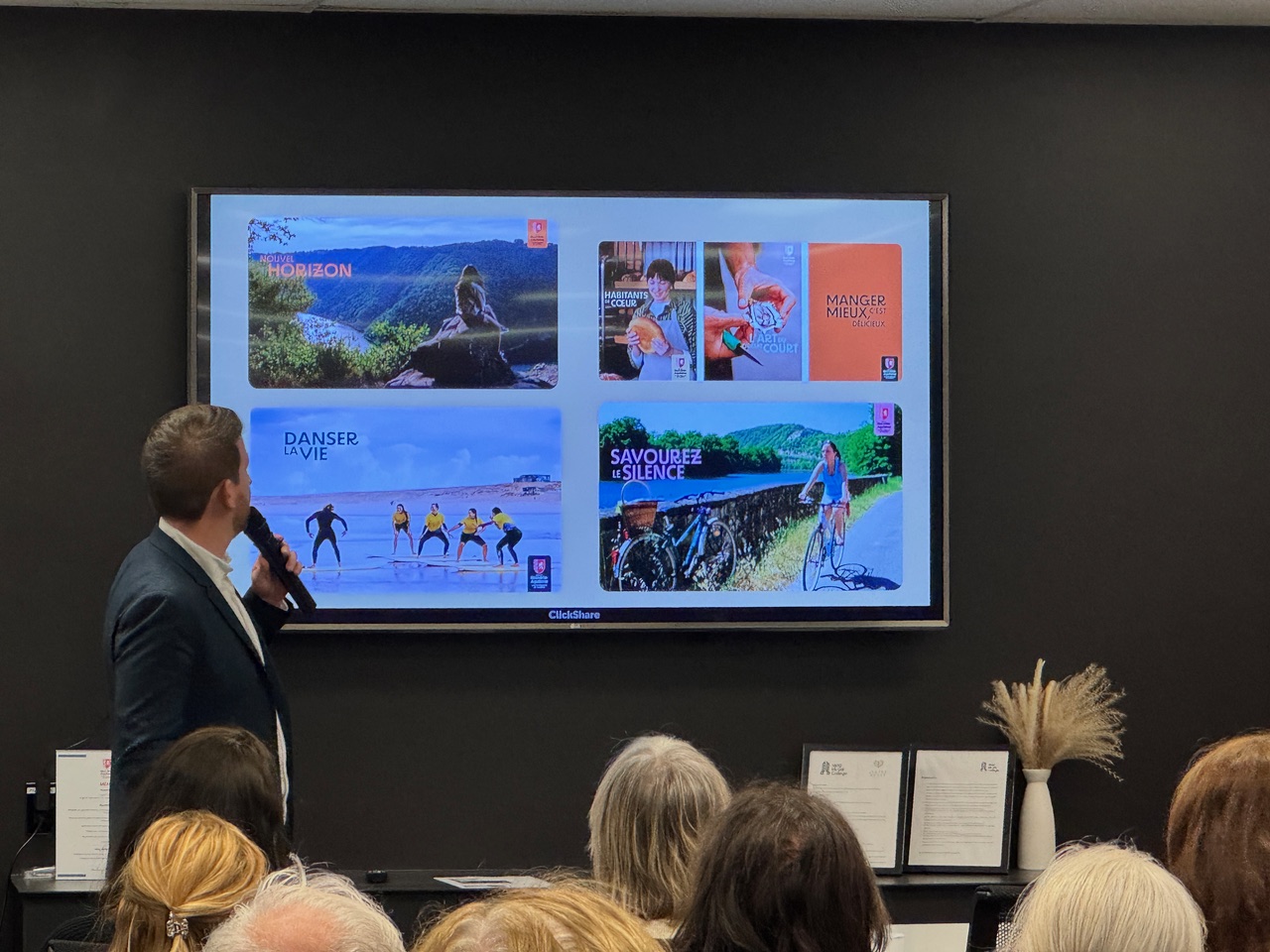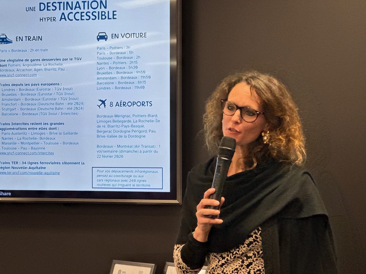 Tenue en la présence de Mélanie Paul-Hus, directrice générale d’Atout France au Canada, la présentation a été menée par Christelle Chassagne, Antony Demel et Céline Boute, respectivement présidente, directeur général adjoint et responsable marchés longs-courrier du Comité régional du tourisme (CRT) de Nouvelle-Aquitaine. Elle visait à faire mieux connaître cette destination multiple à la trentaine de conseillers présents.