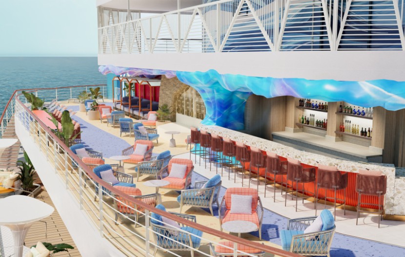 Pour les adultes, le Vibe Beach Club sera 15 % plus grand que sur les précédents navires de la classe Prima, avec des places supplémentaires, des bains à remous à débordement, des lits de jour, un bar et une cascade décorative.