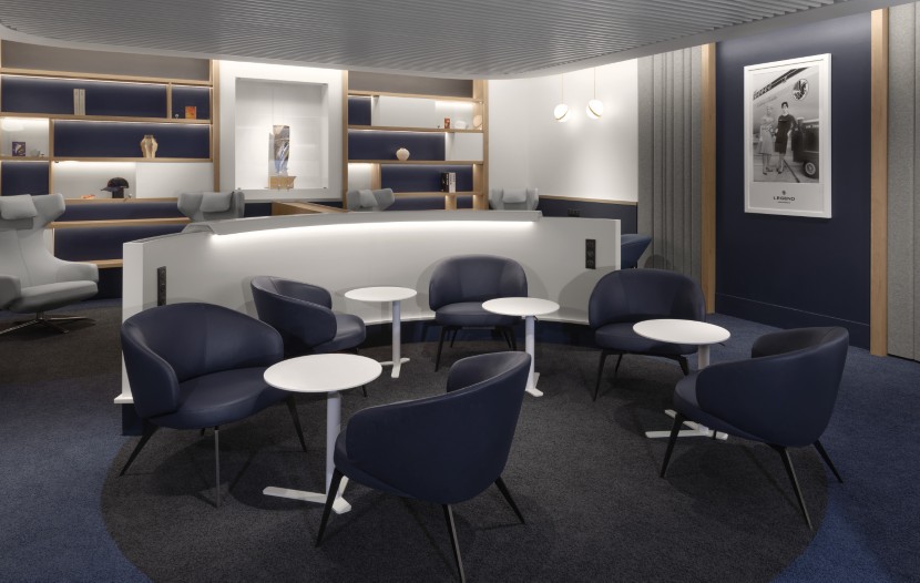 Il décline ses couleurs identitaires – camaïeux de bleu, blanc lumineux, touches de rouge – pour une ambiance épurée et chic. L’usage du bois de chêne et de teintes champagne métallique dans l’élaboration de l’espace apportent chaleur et élégance à l’ensemble. Sélectionné avec soin et parfois reconditionné dans une démarche responsable, son mobilier dispose de finitions soignées.