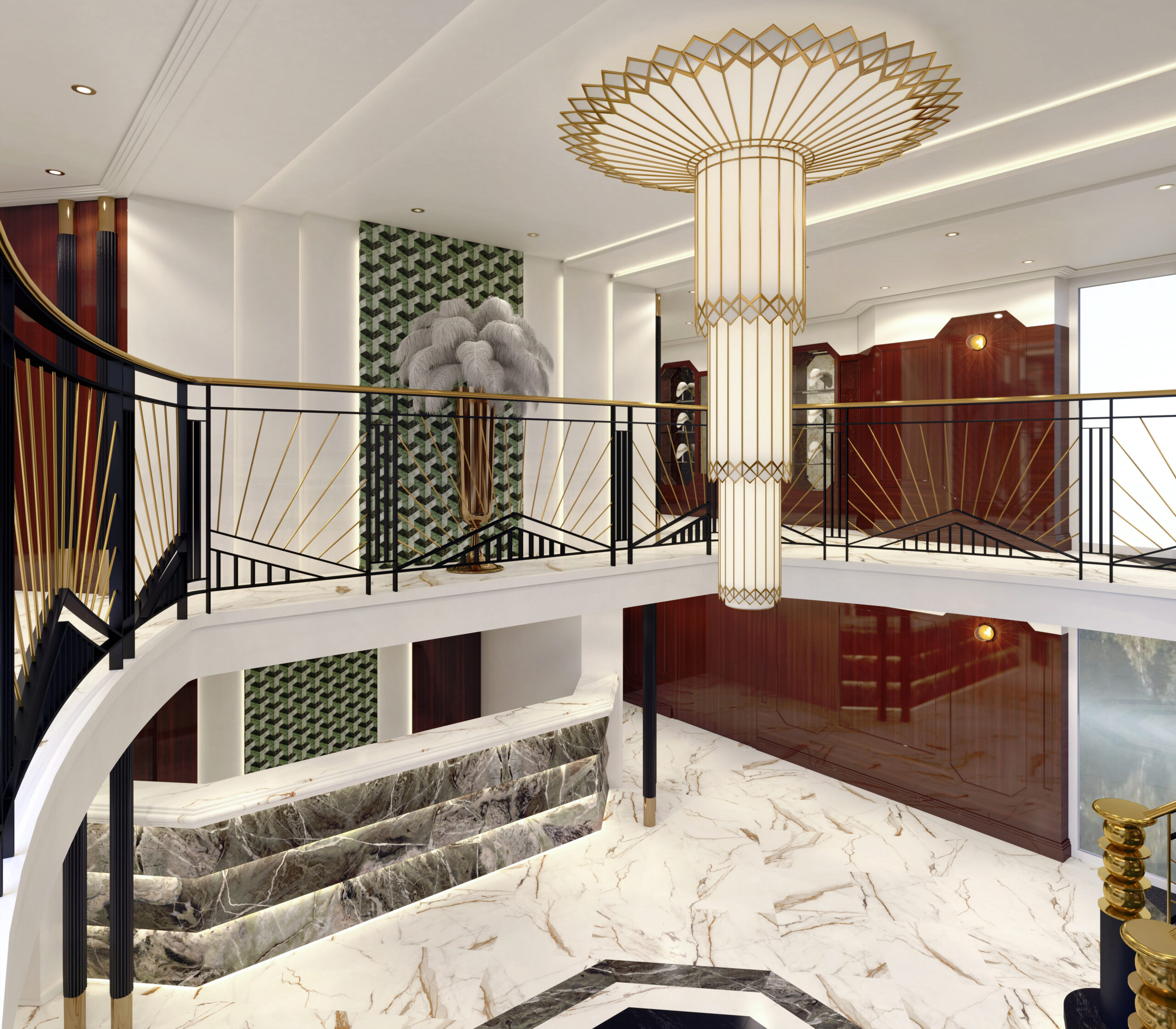 Les intérieurs reflètent son esthétique audacieuse, mêlant des tons chauds beige et or avec des accents spectaculaires de rose, de rouge et de bleu dans certains espaces.