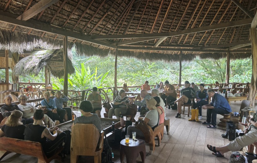 Après les hauteurs de la Sierra, le circuit s’est poursuivi vers l’est du pays, et, en quelques heures, le groupe a quitté les sommets andins pour atteindre les rives de l’Amazonie équatorienne. Les participants ont navigué en pirogue sur la rivière Rio Napo pour se rendre à leur lodge ouvert sur la jungle pour une première immersion dans l’ambiance tropicale.