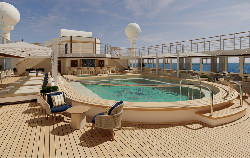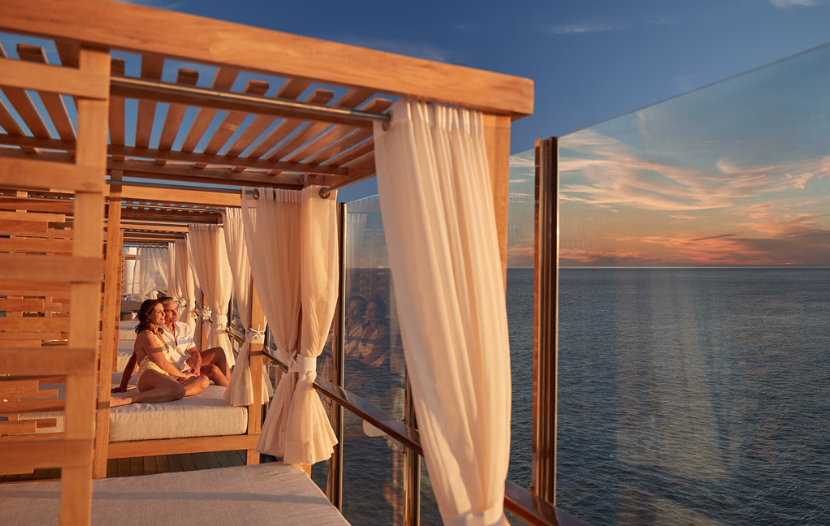 À bord, les infrastructures rappellent davantage un complexe haut de gamme qu’un navire : une grande piscine, quatre bains à remous, un pont-marina avec accès direct à la mer, un spa complet, un centre de mise en forme équipé par Technogym ainsi que des espaces de détente calmes ou animés selon l’heure de la journée.