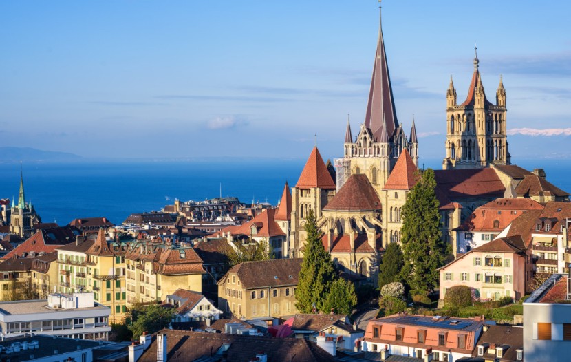 Ville de Lausanne, vue sur la cathédrale gothique historique, les toits de la vieille ville et le lac Léman, Suisse
