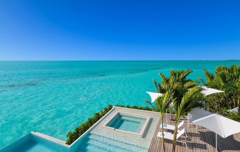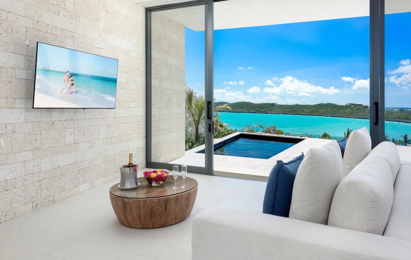 Les quatre chambres avec salle de bains attenante de l’Acua Villa font face à la mer, avec des parois vitrées rétractables qui s’ouvrent sur une cour intérieure habillée de la pierre emblématique des Caïcos. On y trouve une piscine à débordement et une piscine profonde, un salon ouvert et un quai privé avec accès à l’océan.