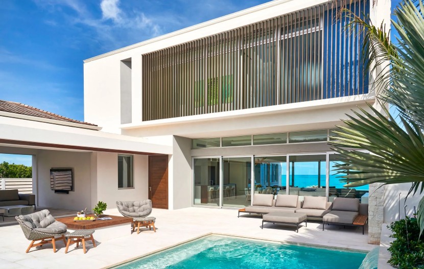Les quatre chambres avec salle de bains attenante de l’Acua Villa font face à la mer, avec des parois vitrées rétractables qui s’ouvrent sur une cour intérieure habillée de la pierre emblématique des Caïcos. On y trouve une piscine à débordement et une piscine profonde, un salon ouvert et un quai privé avec accès à l’océan.