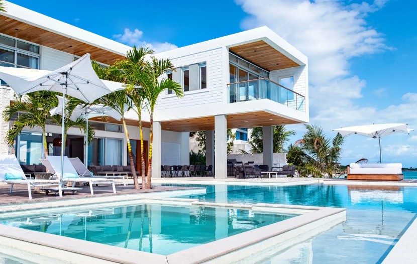 À la fois majestueuse et accueillante, l’Azure Villa s’étend sur 10 000 pieds carrés et compte six chambres, chacune équipée d’une salle de bains digne d’un spa. Plusieurs espaces de vie s’ouvrent sur l’extérieur, où se trouvent deux piscines, des terrasses ensoleillées, des foyers, une végétation luxuriante et une plateforme sur l’eau idéale pour recevoir de grands groupes. »